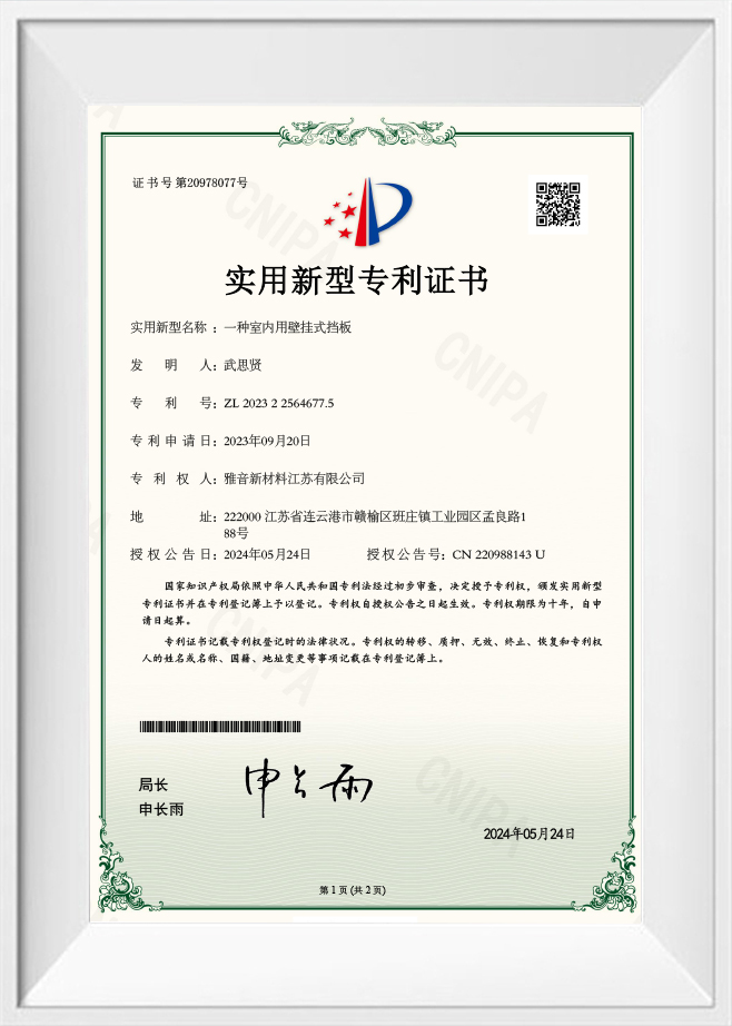 Certificat de brevet pentru un deflector montat pe perete pentru utilizare în interior